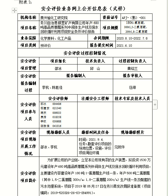 务川自治县银昱矿产有限公司年产680吨高品质蒽醌系列中间体生产线及废水回收循环利用项目安全条件评价报告