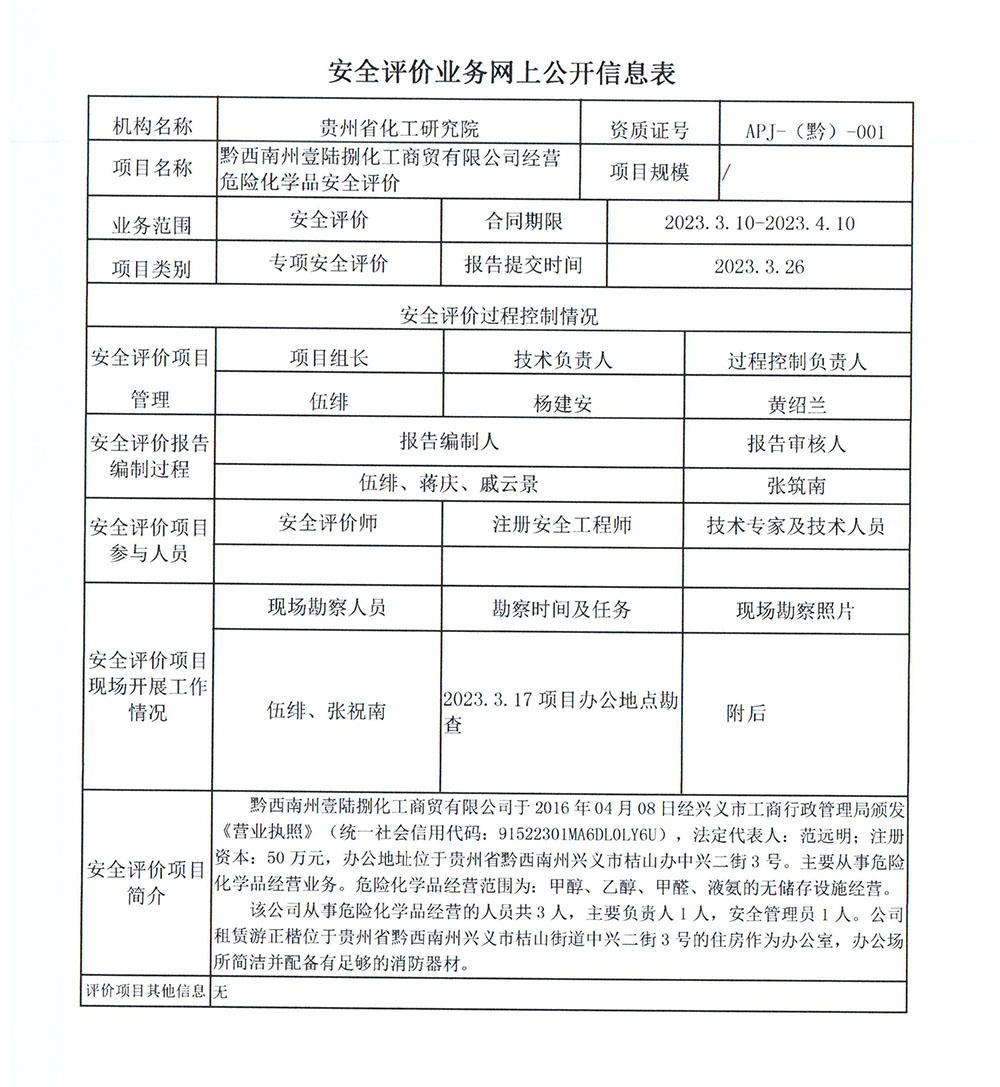 黔西南州壹陆捌化工商贸有限公司经营危险化学品安全评价
